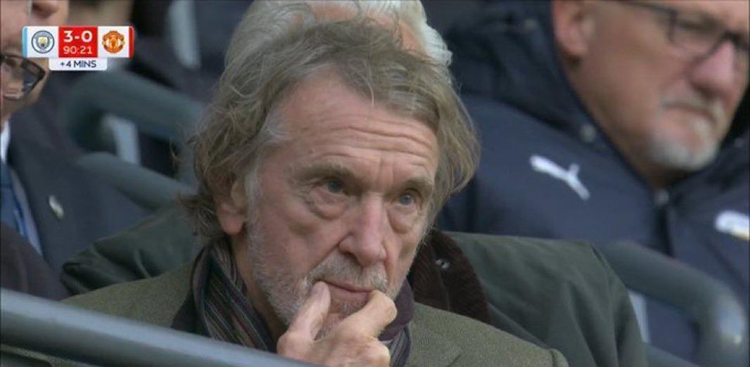 曼彻斯特德比战中,曼联雇主吉姆·拉特克里夫爵士、首席实行官奥马尔·贝拉达和体育总监贾森·威尔考克斯一王人现场不雅战,而他们看到了一场不胜入观念施展,拉爵用手捂住了双眼,不忍直视。名宿加里·内维尔言不及义:「这集我看过!」