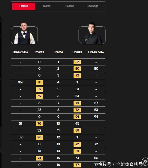 这场比赛第一阶段开场后,王雨晨最初发力,71-37先拔头筹,这之后又接连胜出,并以一波六连鞭取得连胜六局的战绩。开局慢热的布莱恩-西尼,从第七局运行打出两杆50+(51分、57分),连扳三局之后,布莱恩-西尼在第一阶段遏抑的时候,将比分追成3-6。
